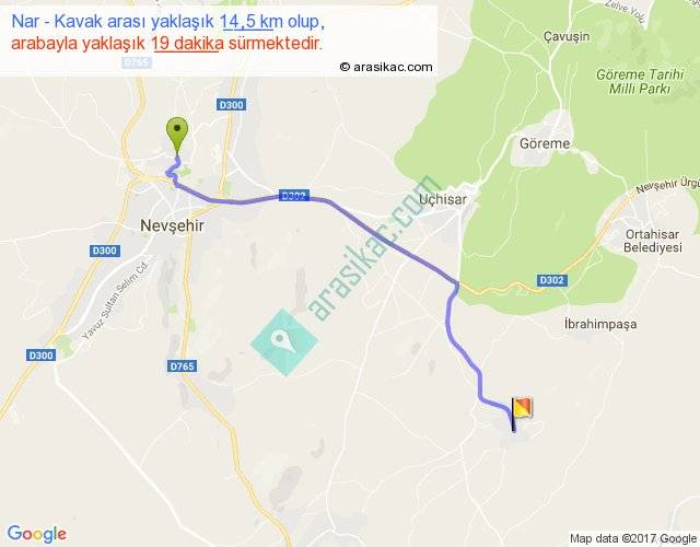 Nar - Kavak arası yaklaşık olarak 90 km/h ile yukarıda belirtilen sürede olup, iki yerin kuş uçuşu uzaklığı (mesafesi) 12'dir. Yolculuk otobüsle 24 dakika sürmektedir.