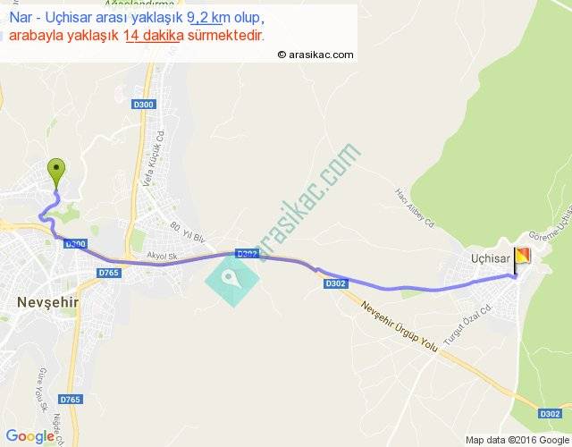 Nar - Uçhisar arası yaklaşık olarak 90 km/h ile yukarıda belirtilen sürede olup, iki yerin kuş uçuşu uzaklığı (mesafesi) 8'dir. Yolculuk otobüsle 18 dakika sürmektedir.