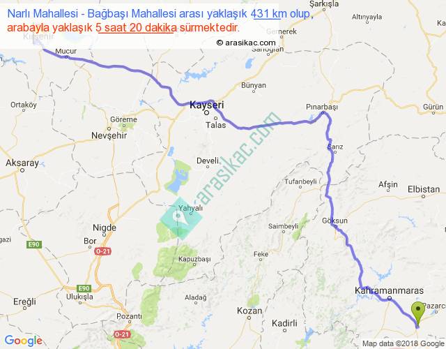 Narlı Mahallesi - Bağbaşı Mahallesi arası yaklaşık olarak 90 km/h ile yukarıda belirtilen sürede olup, iki yerin kuş uçuşu uzaklığı (mesafesi) 326'dir. Eğer belirtilen yerler arasında uçak seferi var ise bu süre uçakla 30 dakika'ya kadar düşebilir. Yolculuk otobüsle 6 saat 56 dakika sürmektedir.