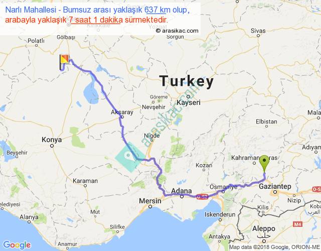Narlı Mahallesi - Bumsuz arası yaklaşık olarak 90 km/h ile yukarıda belirtilen sürede olup, iki yerin kuş uçuşu uzaklığı (mesafesi) 434'dir. Eğer belirtilen yerler arasında uçak seferi var ise bu süre uçakla 40 dakika'ya kadar düşebilir. Yolculuk otobüsle 9 saat 7 dakika sürmektedir.