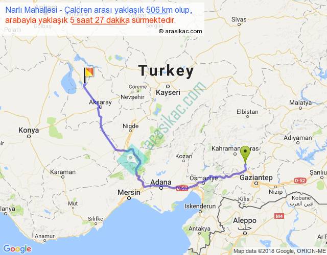 Narlı Mahallesi - Çalören arası yaklaşık olarak 90 km/h ile yukarıda belirtilen sürede olup, iki yerin kuş uçuşu uzaklığı (mesafesi) 336'dir. Eğer belirtilen yerler arasında uçak seferi var ise bu süre uçakla 31 dakika'ya kadar düşebilir. Yolculuk otobüsle 7 saat 5 dakika sürmektedir.