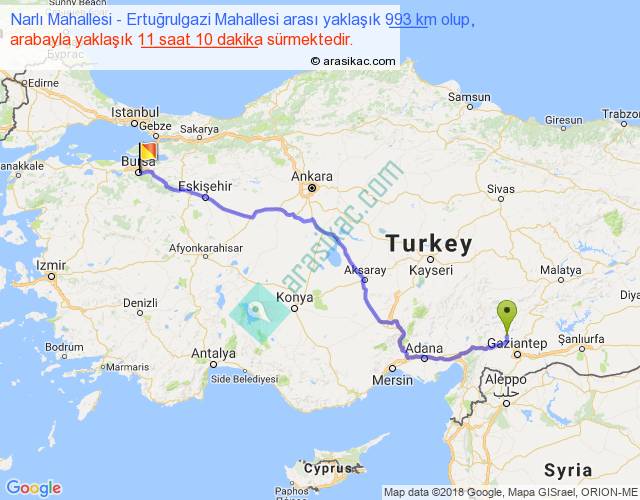 Narlı Mahallesi - Ertuğrulgazi Mahallesi arası yaklaşık olarak 90 km/h ile yukarıda belirtilen sürede olup, iki yerin kuş uçuşu uzaklığı (mesafesi) 757'dir. Eğer belirtilen yerler arasında uçak seferi var ise bu süre uçakla 1 saat 09 dakika'ya kadar düşebilir. Yolculuk otobüsle 14 saat 31 dakika sürmektedir.