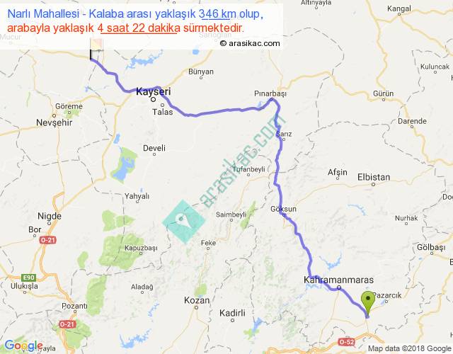 Narlı Mahallesi - Kalaba arası yaklaşık olarak 90 km/h ile yukarıda belirtilen sürede olup, iki yerin kuş uçuşu uzaklığı (mesafesi) 255'dir. Eğer belirtilen yerler arasında uçak seferi var ise bu süre uçakla 23 dakika'ya kadar düşebilir. Yolculuk otobüsle 5 saat 40 dakika sürmektedir.