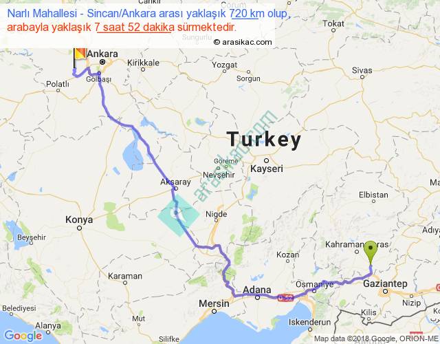 Narlı Mahallesi - Sincan Ankara arası yaklaşık olarak 90 km/h ile yukarıda belirtilen sürede olup, iki yerin kuş uçuşu uzaklığı (mesafesi) 490'dir. Eğer belirtilen yerler arasında uçak seferi var ise bu süre uçakla 45 dakika'ya kadar düşebilir. Yolculuk otobüsle 10 saat 13 dakika sürmektedir.