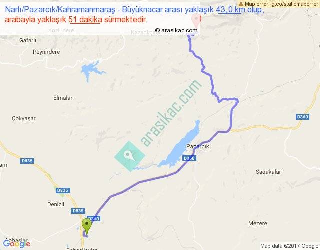 Narlı Pazarcık Kahramanmaraş - Büyüknacar arası yaklaşık olarak 90 km/h ile yukarıda belirtilen sürede olup, iki yerin kuş uçuşu uzaklığı (mesafesi) 28'dir. Yolculuk otobüsle 1 saat 6 dakika sürmektedir.