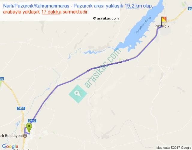 Narlı Pazarcık Kahramanmaraş - Pazarcık arası yaklaşık olarak 90 km/h ile yukarıda belirtilen sürede olup, iki yerin kuş uçuşu uzaklığı (mesafesi) 17'dir. Yolculuk otobüsle 22 dakika sürmektedir.