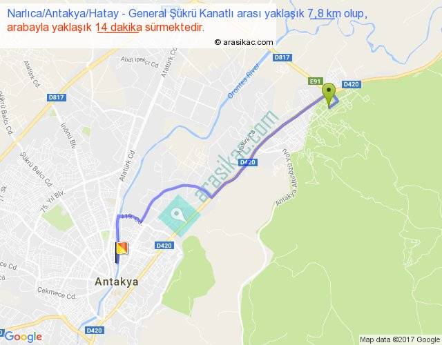 Narlıca Antakya Hatay - General Şükrü Kanatlı arası yaklaşık olarak 90 km/h ile yukarıda belirtilen sürede olup, iki yerin kuş uçuşu uzaklığı (mesafesi) 6'dir. Yolculuk otobüsle 18 dakika sürmektedir.