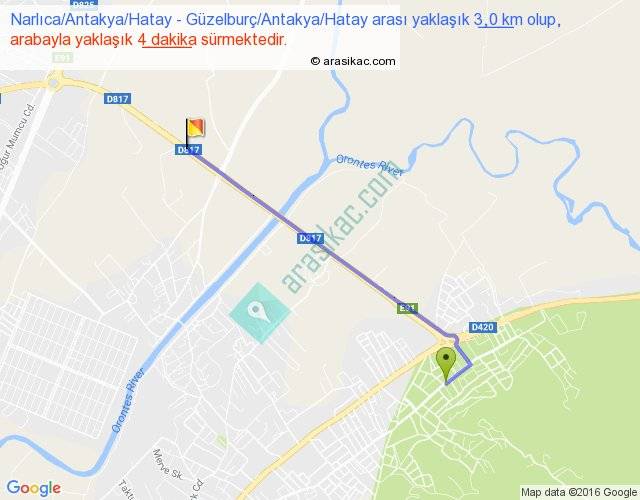 Narlıca Antakya Hatay - Güzelburç Antakya Hatay arası yaklaşık olarak 90 km/h ile yukarıda belirtilen sürede olup, iki yerin kuş uçuşu uzaklığı (mesafesi) 3'dir. Yolculuk otobüsle 5 dakika sürmektedir.