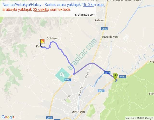 Narlıca Antakya Hatay - Karlısu arası yaklaşık olarak 90 km/h ile yukarıda belirtilen sürede olup, iki yerin kuş uçuşu uzaklığı (mesafesi) 11'dir. Yolculuk otobüsle 28 dakika sürmektedir.