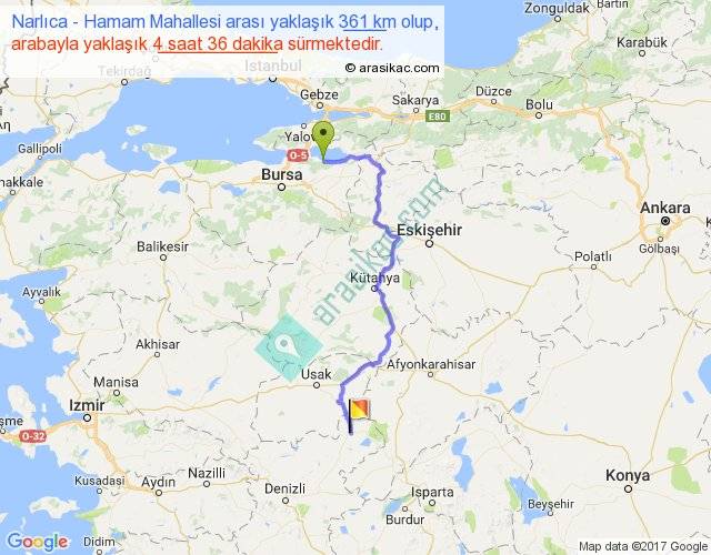 Narlıca - Hamam Mahallesi arası yaklaşık olarak 90 km/h ile yukarıda belirtilen sürede olup, iki yerin kuş uçuşu uzaklığı (mesafesi) 231'dir. Yolculuk otobüsle 5 saat 58 dakika sürmektedir.
