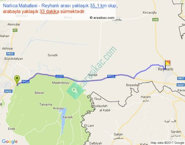 Narlıca Mahallesi - Reyhanlı arası yaklaşık olarak 90 km/h ile yukarıda belirtilen sürede olup, iki yerin kuş uçuşu uzaklığı (mesafesi) 32'dir. Yolculuk otobüsle 42 dakika sürmektedir.