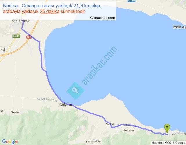 Narlıca - Orhangazi arası yaklaşık olarak 90 km/h ile yukarıda belirtilen sürede olup, iki yerin kuş uçuşu uzaklığı (mesafesi) 18'dir. Yolculuk otobüsle 32 dakika sürmektedir.
