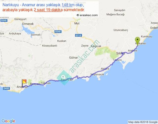 Narlıkuyu - Anamur arası yaklaşık olarak 90 km/h ile yukarıda belirtilen sürede olup, iki yerin kuş uçuşu uzaklığı (mesafesi) 121'dir. Yolculuk otobüsle 3 saat 0 dakika sürmektedir.
