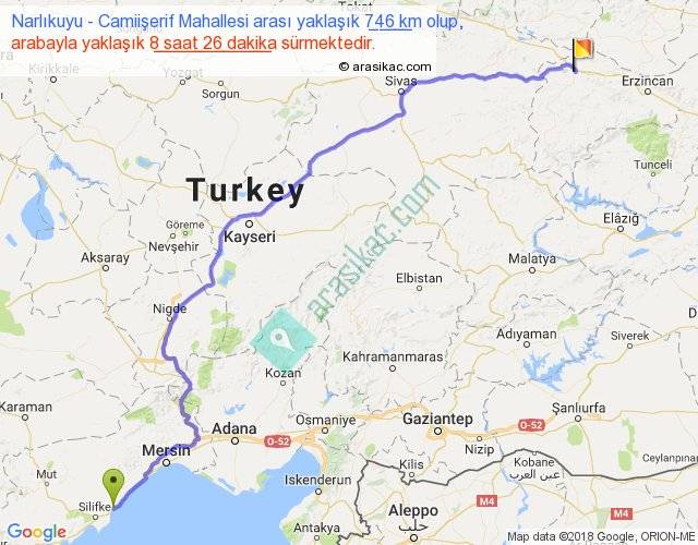 Narlıkuyu - Camiişerif Mahallesi arası yaklaşık olarak 90 km/h ile yukarıda belirtilen sürede olup, iki yerin kuş uçuşu uzaklığı (mesafesi) 556'dir. Eğer belirtilen yerler arasında uçak seferi var ise bu süre uçakla 51 dakika'ya kadar düşebilir. Yolculuk otobüsle 10 saat 57 dakika sürmektedir.