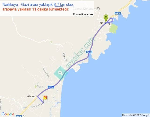 Narlıkuyu - Gazi arası yaklaşık olarak 90 km/h ile yukarıda belirtilen sürede olup, iki yerin kuş uçuşu uzaklığı (mesafesi) 7'dir. Yolculuk otobüsle 14 dakika sürmektedir.