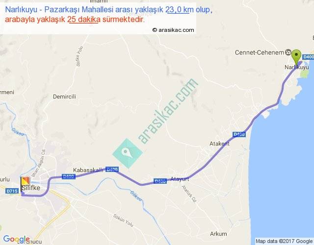 Narlıkuyu - Pazarkaşı Mahallesi arası yaklaşık olarak 90 km/h ile yukarıda belirtilen sürede olup, iki yerin kuş uçuşu uzaklığı (mesafesi) 19'dir. Yolculuk otobüsle 32 dakika sürmektedir.
