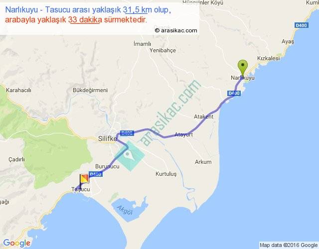 Narlıkuyu - Tasucu arası yaklaşık olarak 90 km/h ile yukarıda belirtilen sürede olup, iki yerin kuş uçuşu uzaklığı (mesafesi) 24'dir. Yolculuk otobüsle 42 dakika sürmektedir.
