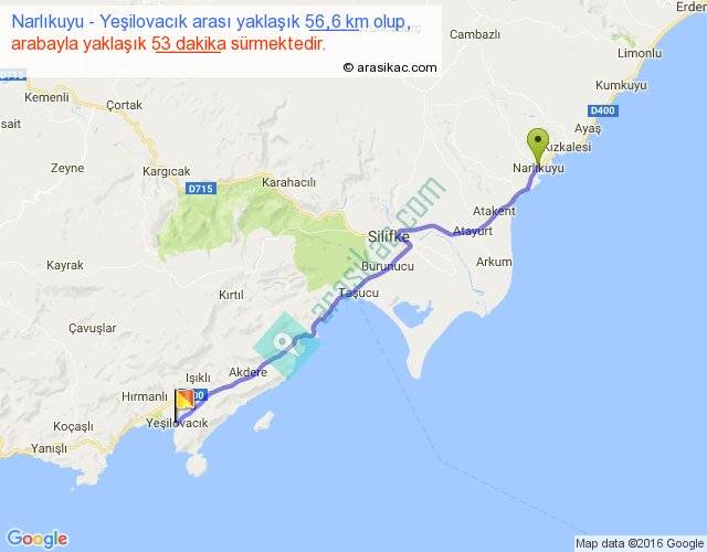 Narlıkuyu - Yeşilovacık arası yaklaşık olarak 90 km/h ile yukarıda belirtilen sürede olup, iki yerin kuş uçuşu uzaklığı (mesafesi) 49'dir. Yolculuk otobüsle 1 saat 8 dakika sürmektedir.
