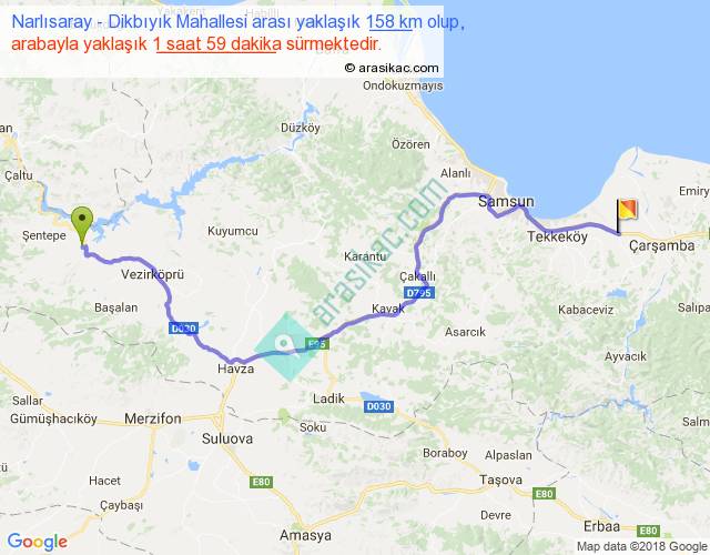 Narlısaray - Dikbıyık Mahallesi arası yaklaşık olarak 90 km/h ile yukarıda belirtilen sürede olup, iki yerin kuş uçuşu uzaklığı (mesafesi) 111'dir. Yolculuk otobüsle 2 saat 34 dakika sürmektedir.