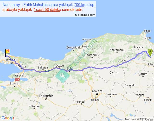 Narlısaray - Fatih Mahallesi arası yaklaşık olarak 90 km/h ile yukarıda belirtilen sürede olup, iki yerin kuş uçuşu uzaklığı (mesafesi) 548'dir. Eğer belirtilen yerler arasında uçak seferi var ise bu süre uçakla 50 dakika'ya kadar düşebilir. Yolculuk otobüsle 10 saat 11 dakika sürmektedir.