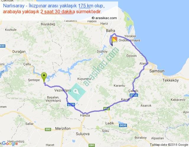 Narlısaray - İkizpınar arası yaklaşık olarak 90 km/h ile yukarıda belirtilen sürede olup, iki yerin kuş uçuşu uzaklığı (mesafesi) 60'dir. Yolculuk otobüsle 3 saat 15 dakika sürmektedir.
