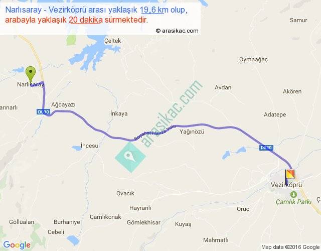 Narlısaray - Vezirköprü arası yaklaşık olarak 90 km/h ile yukarıda belirtilen sürede olup, iki yerin kuş uçuşu uzaklığı (mesafesi) 16'dir. Yolculuk otobüsle 26 dakika sürmektedir.