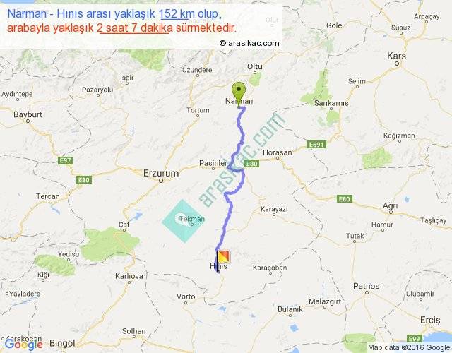 Narman - Hınıs arası yaklaşık olarak 90 km/h ile yukarıda belirtilen sürede olup, iki yerin kuş uçuşu uzaklığı (mesafesi) 110'dir. Yolculuk otobüsle 2 saat 45 dakika sürmektedir.