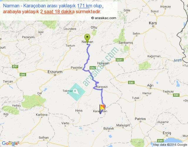 Narman - Karaçoban arası yaklaşık olarak 90 km/h ile yukarıda belirtilen sürede olup, iki yerin kuş uçuşu uzaklığı (mesafesi) 112'dir. Yolculuk otobüsle 2 saat 59 dakika sürmektedir.