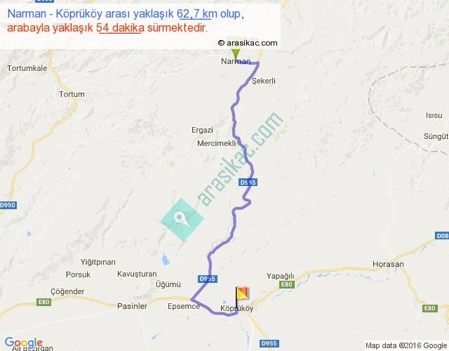 Narman - Köprüköy arası yaklaşık olarak 90 km/h ile yukarıda belirtilen sürede olup, iki yerin kuş uçuşu uzaklığı (mesafesi) 41'dir. Yolculuk otobüsle 1 saat 10 dakika sürmektedir.