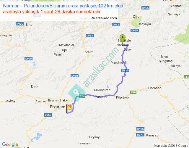 Narman - Palandöken Erzurum arası yaklaşık olarak 90 km/h ile yukarıda belirtilen sürede olup, iki yerin kuş uçuşu uzaklığı (mesafesi) 69'dir. Yolculuk otobüsle 1 saat 54 dakika sürmektedir.