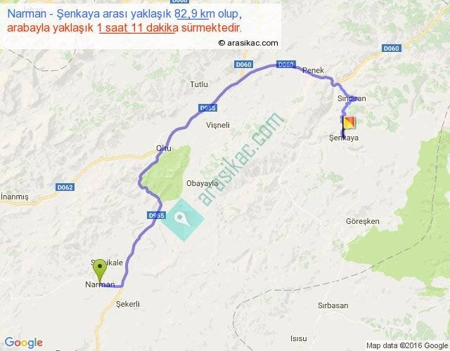 Narman - Şenkaya arası yaklaşık olarak 90 km/h ile yukarıda belirtilen sürede olup, iki yerin kuş uçuşu uzaklığı (mesafesi) 47'dir. Yolculuk otobüsle 1 saat 32 dakika sürmektedir.