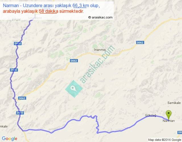 Narman - Uzundere arası yaklaşık olarak 90 km/h ile yukarıda belirtilen sürede olup, iki yerin kuş uçuşu uzaklığı (mesafesi) 34'dir. Yolculuk otobüsle 1 saat 15 dakika sürmektedir.