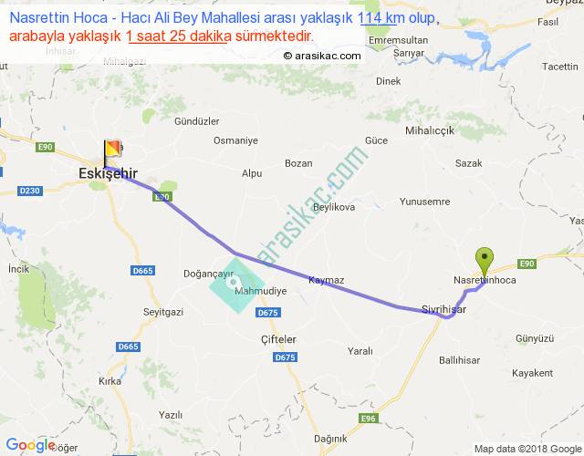 Nasrettin Hoca - Hacı Ali Bey Mahallesi arası yaklaşık olarak 90 km/h ile yukarıda belirtilen sürede olup, iki yerin kuş uçuşu uzaklığı (mesafesi) 101'dir. Yolculuk otobüsle 1 saat 50 dakika sürmektedir.