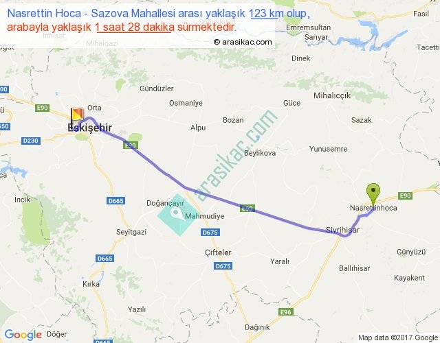 Nasrettin Hoca - Sazova Mahallesi arası yaklaşık olarak 90 km/h ile yukarıda belirtilen sürede olup, iki yerin kuş uçuşu uzaklığı (mesafesi) 106'dir. Yolculuk otobüsle 1 saat 54 dakika sürmektedir.