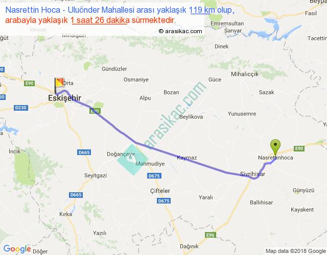 Nasrettin Hoca - Uluönder Mahallesi arası yaklaşık olarak 90 km/h ile yukarıda belirtilen sürede olup, iki yerin kuş uçuşu uzaklığı (mesafesi) 105'dir. Yolculuk otobüsle 1 saat 51 dakika sürmektedir.