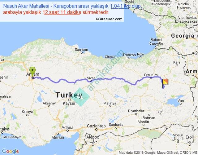 Nasuh Akar Mahallesi - Karaçoban arası yaklaşık olarak 90 km/h ile yukarıda belirtilen sürede olup, iki yerin kuş uçuşu uzaklığı (mesafesi) 792'dir. Eğer belirtilen yerler arasında uçak seferi var ise bu süre uçakla 1 saat 13 dakika'ya kadar düşebilir. Yolculuk otobüsle 15 saat 50 dakika sürmektedir.