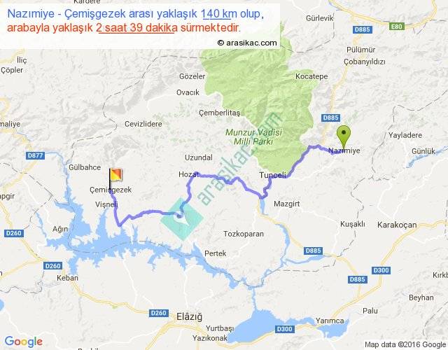 Nazımiye - Çemişgezek arası yaklaşık olarak 90 km/h ile yukarıda belirtilen sürede olup, iki yerin kuş uçuşu uzaklığı (mesafesi) 80'dir. Yolculuk otobüsle 3 saat 26 dakika sürmektedir.