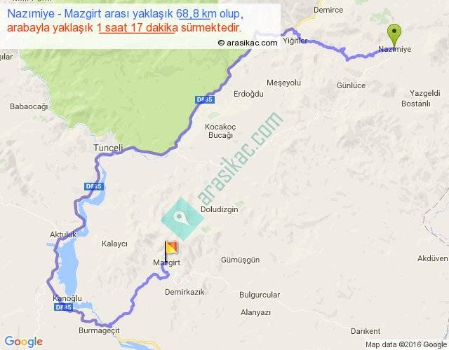 Nazımiye - Mazgirt arası yaklaşık olarak 90 km/h ile yukarıda belirtilen sürede olup, iki yerin kuş uçuşu uzaklığı (mesafesi) 26'dir. Yolculuk otobüsle 1 saat 40 dakika sürmektedir.