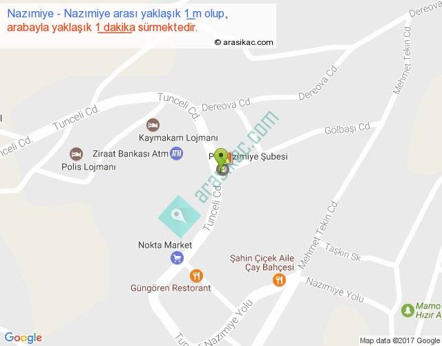 Nazımiye - Nazımiye arası yaklaşık olarak 90 km/h ile yukarıda belirtilen sürede olup, iki yerin kuş uçuşu uzaklığı (mesafesi) 0'dir. Yolculuk otobüsle 1 dakika sürmektedir.