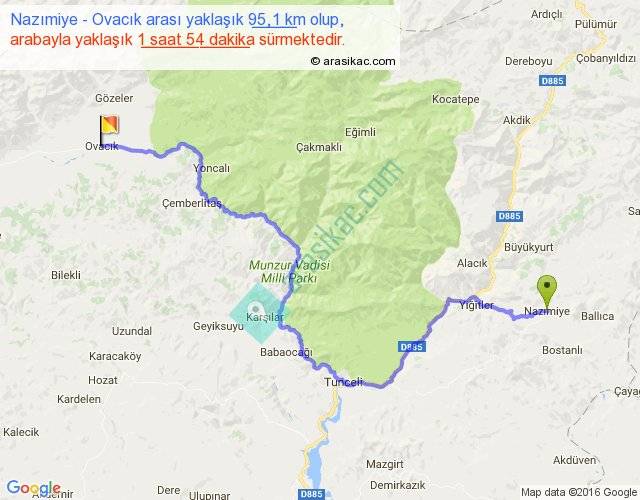Nazımiye - Ovacık arası yaklaşık olarak 90 km/h ile yukarıda belirtilen sürede olup, iki yerin kuş uçuşu uzaklığı (mesafesi) 56'dir. Yolculuk otobüsle 2 saat 28 dakika sürmektedir.