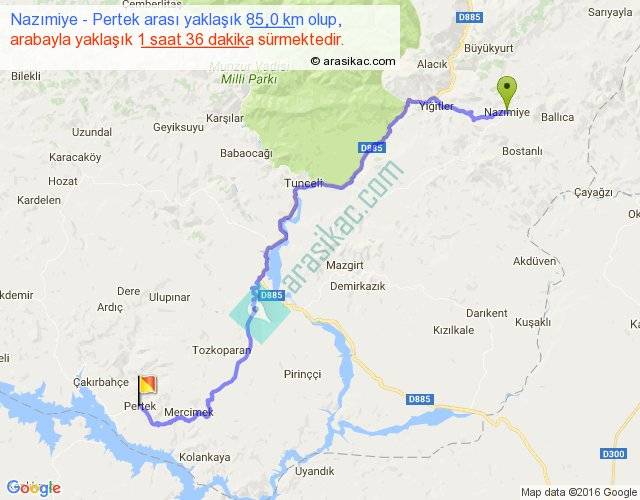 Nazımiye - Pertek arası yaklaşık olarak 90 km/h ile yukarıda belirtilen sürede olup, iki yerin kuş uçuşu uzaklığı (mesafesi) 55'dir. Yolculuk otobüsle 2 saat 4 dakika sürmektedir.