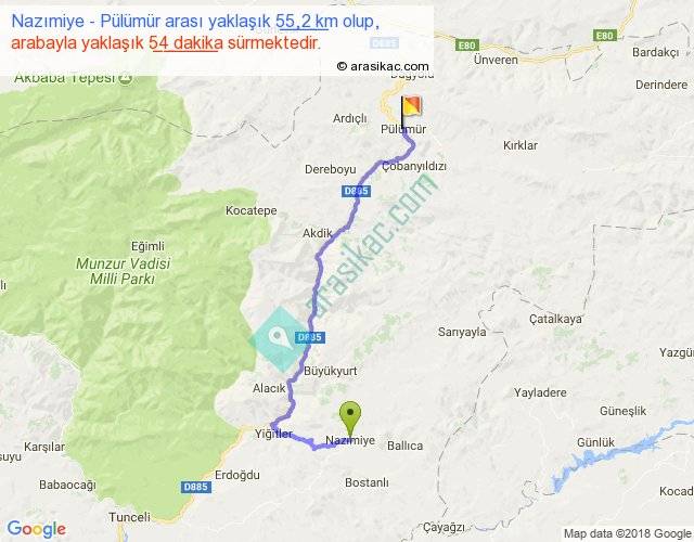 Nazımiye - Pülümür arası yaklaşık olarak 90 km/h ile yukarıda belirtilen sürede olup, iki yerin kuş uçuşu uzaklığı (mesafesi) 34'dir. Yolculuk otobüsle 1 saat 14 dakika sürmektedir.