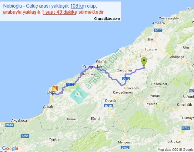 Nebioğlu - Gülüç arası yaklaşık olarak 90 km/h ile yukarıda belirtilen sürede olup, iki yerin kuş uçuşu uzaklığı (mesafesi) 72'dir. Yolculuk otobüsle 2 saat 21 dakika sürmektedir.