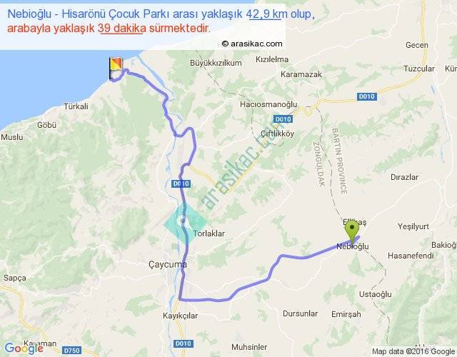 Nebioğlu - Hisarönü Çocuk Parkı arası yaklaşık olarak 90 km/h ile yukarıda belirtilen sürede olup, iki yerin kuş uçuşu uzaklığı (mesafesi) 23'dir. Yolculuk otobüsle 50 dakika sürmektedir.