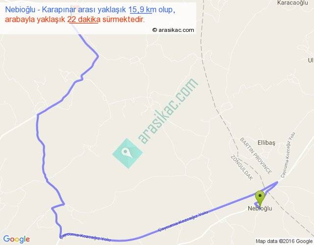Nebioğlu - Karapınar arası yaklaşık olarak 90 km/h ile yukarıda belirtilen sürede olup, iki yerin kuş uçuşu uzaklığı (mesafesi) 8'dir. Yolculuk otobüsle 28 dakika sürmektedir.