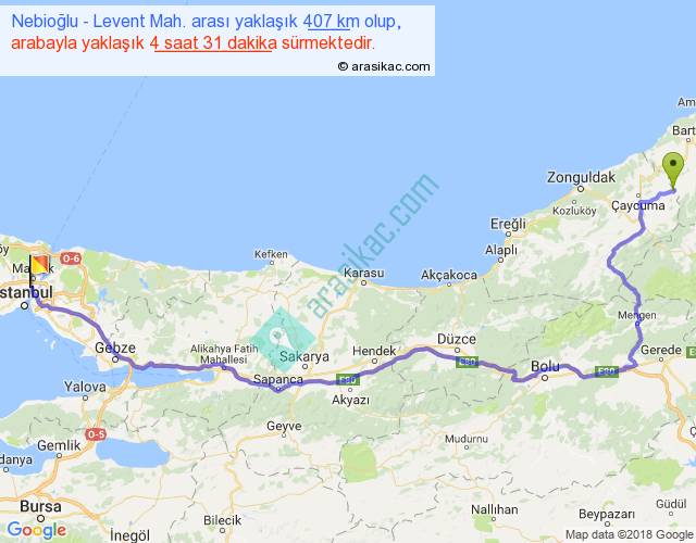 Nebioğlu - Levent Mah. arası yaklaşık olarak 90 km/h ile yukarıda belirtilen sürede olup, iki yerin kuş uçuşu uzaklığı (mesafesi) 272'dir. Eğer belirtilen yerler arasında uçak seferi var ise bu süre uçakla 25 dakika'ya kadar düşebilir. Yolculuk otobüsle 5 saat 52 dakika sürmektedir.