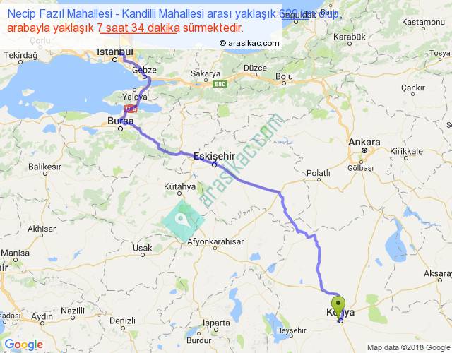 Necip Fazıl Mahallesi - Kandilli Mahallesi arası yaklaşık olarak 90 km/h ile yukarıda belirtilen sürede olup, iki yerin kuş uçuşu uzaklığı (mesafesi) 457'dir. Eğer belirtilen yerler arasında uçak seferi var ise bu süre uçakla 42 dakika'ya kadar düşebilir. Yolculuk otobüsle 9 saat 50 dakika sürmektedir.