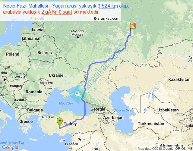 Necip Fazıl Mahallesi - Yagan arası yaklaşık olarak 90 km/h ile yukarıda belirtilen sürede olup, iki yerin kuş uçuşu uzaklığı (mesafesi) 2563'dir. Eğer belirtilen yerler arasında uçak seferi var ise bu süre uçakla 3 saat 56 dakika'ya kadar düşebilir. Yolculuk otobüsle 2 gün 14 saat sürmektedir.