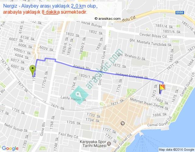 Nergiz - Alaybey arası yaklaşık olarak 90 km/h ile yukarıda belirtilen sürede olup, iki yerin kuş uçuşu uzaklığı (mesafesi) 2'dir. Yolculuk otobüsle 10 dakika sürmektedir.