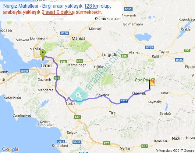 Nergiz Mahallesi - Birgi arası yaklaşık olarak 90 km/h ile yukarıda belirtilen sürede olup, iki yerin kuş uçuşu uzaklığı (mesafesi) 87'dir. Yolculuk otobüsle 2 saat 36 dakika sürmektedir.